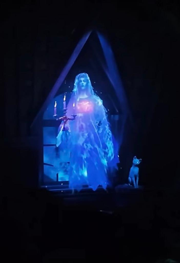 The new Bride stands in the same spot across from the Hat Box Ghost and now has a window in the attic behind her. The face appears a little odd-shaped, but the effect of her flowing dress is fantastic. The wedding pictures have also changed. Constance’s husbands featured their heads disappearing, and now the entire husband vanishes. Beside her is the spirit of the one-eyed cat from the loading area where you climb aboard your Doom Buggy. This was a nice touch for Mansion fans, who can point and look like a meme in their excitement.