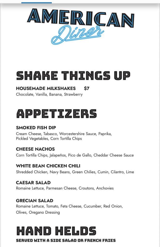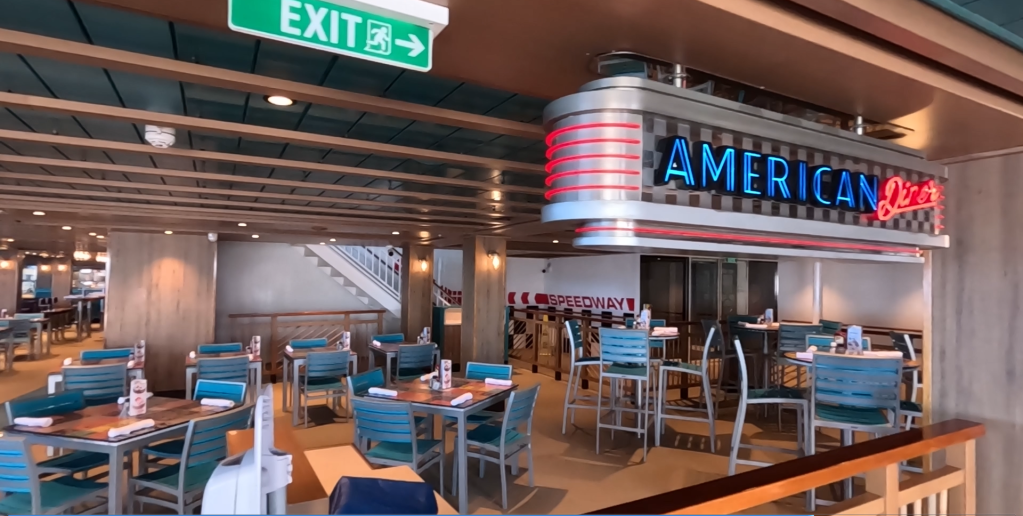 Welcome to the Crossroads! This is the place for my experiences and reviews on the road, on cruises, or in or about Disney/Universal Studios. I’m eating at and reviewing another restaurant on the Norwegian Bliss, the American Diner. Located on deck 17, the American Diner is included with your cruise fare. It is only open for lunch, from 12 pm to 5 pm. The only thing that isn’t included is the milkshakes, which are $7 each. The milkshakes also do not count for the More At Sea beverage package. If you want a milkshake, you’re paying for it.