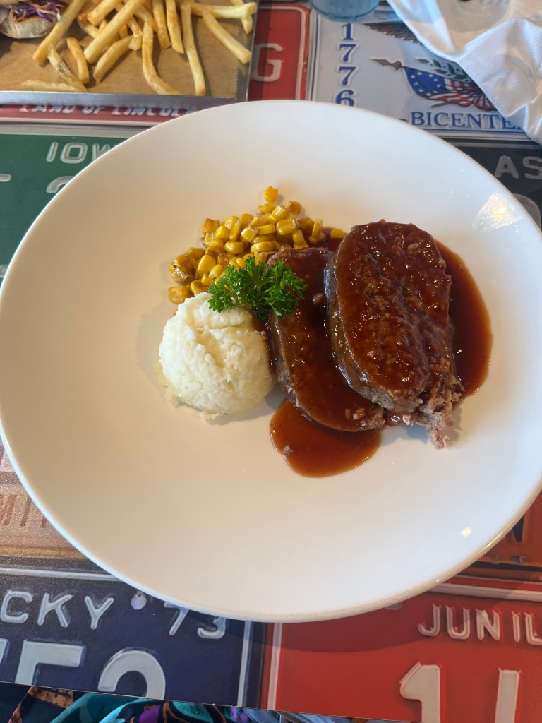 The sliders were average. They needed more sauce, and the slaw was bland. The Hawaiian rolls were good, and the fries were of the nice, thin, and crispy variety. Overall, the sliders were okay, but not something I’d beat the door down to order again. The meatloaf was surprisingly good. It was served with grilled corn and mashed potatoes. I wasn’t a big fan of the gravy, but it didn’t detract from the meatloaf’s flavor. I would’ve ordered it again if I had dined at the American Diner a few more times. The corn was good, and the potatoes were bland, but it was passable when you put the meatloaf gravy on it. I’d place the main dishes as above average.
