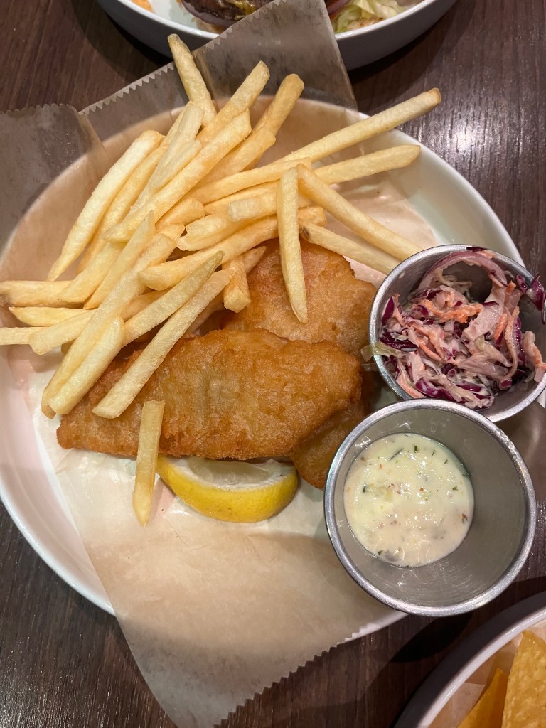 The main dishes were mostly sandwiches and burgers, keeping with the pub atmosphere. Some of the menu items are available at The American Diner, so you can eat them in several locations. The menu highlights include the Reuben, Coney Island Hot Dog, and the classic pub favorite fish and chips. We also tried the Wrangler burger, blue cheese burger, and tavern-battered fish sandwich. Each menu item was good, and I recommend trying everything on the menu. The only disappointing things were the fries and the enormous amount of bread on the hot dogs. I don’t eat a lot of buns with things, so I had to remove half of the bun to taste the actual hot dog and toppings through all the bread. The fries would’ve tasted better warm, but since the food appeared to be batched out of the kitchen, you could tell some of the plated fries sat out for a while once they hit the plate. Guy’s Burgers on Carnival still has the best fries, and those bad boys are hard to beat.