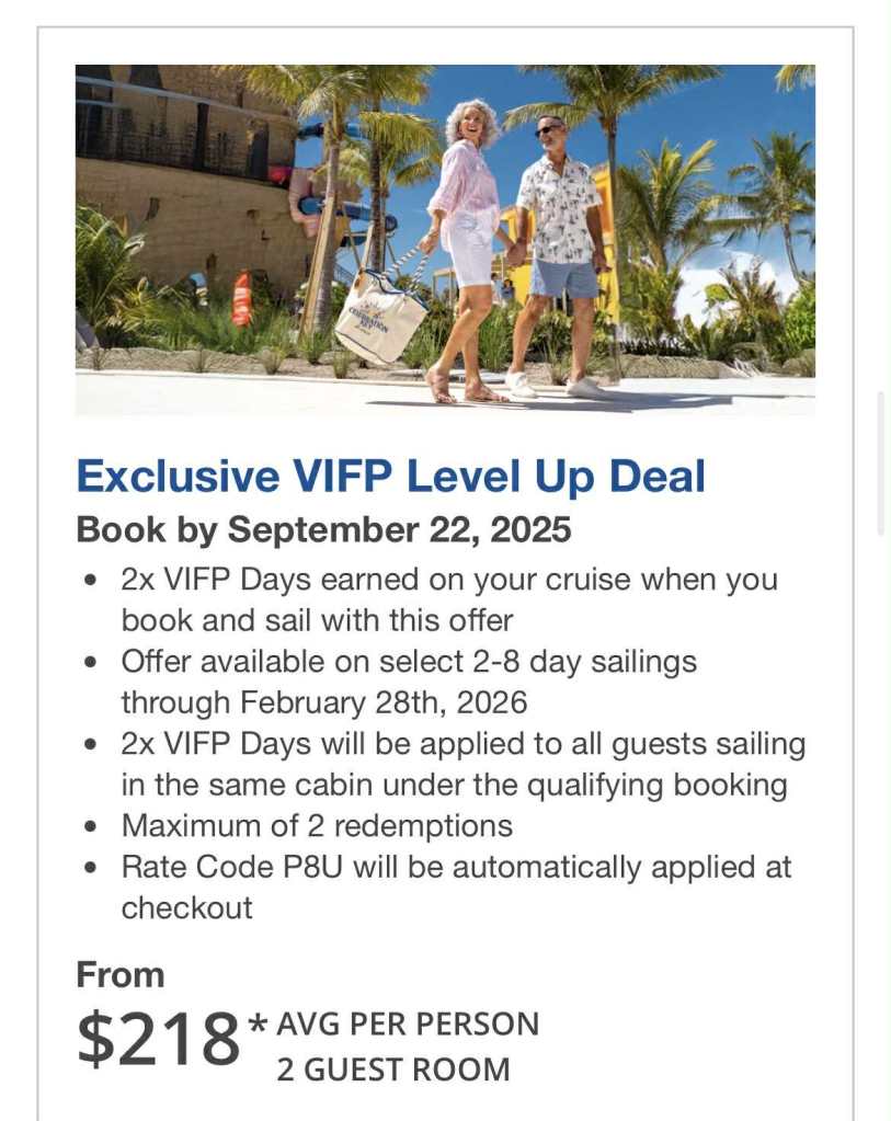 I made a follow-up video on the YouTube channel, discussing this offer and what it does. It’s limited, but it will help those close to either Diamond or Platinum reach that next tier before the May 31, 2026, cut-off date. The response for bookings has been high enough that the Carnival site crashed. If you’re close to that next level, take advantage quickly before the sailings get booked. After making a mock booking, I found that many cheaper rooms have already been taken.